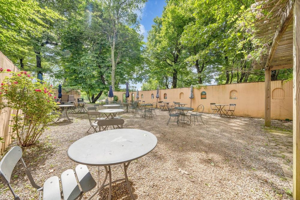 - Splendid Italian-style walled music garden with seating and a stage area for music events